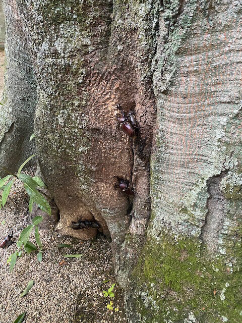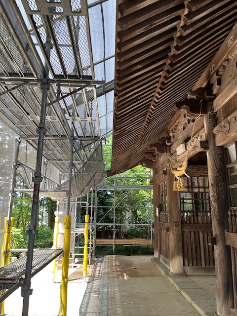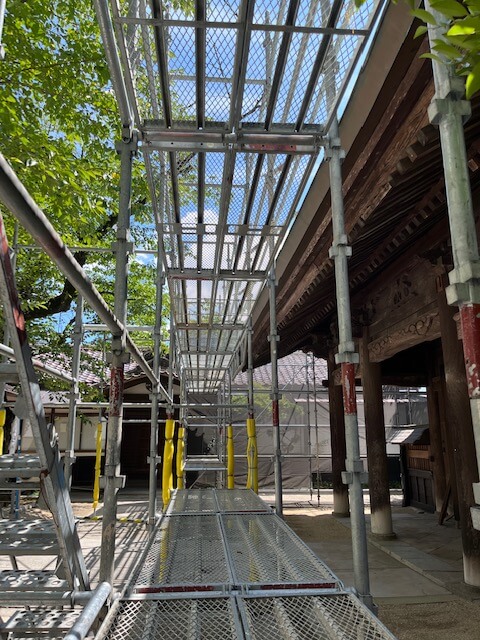 先日の地震では随身門の屋根の銅版が数枚剝がれましたが、調査の結果、屋根の野地板に長年にわたり雨水が浸み込んでおり、大規模な修理が必要となりました。