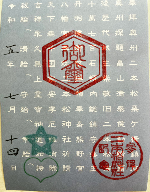 先にお配りいたしました人形(ひとがた)と交通安全祈願書を7月31日(月)~8月1日(火)までに社殿にお納めください。