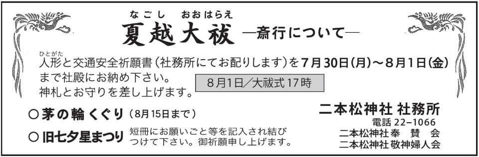 人型(ひとがた)と交通安全祈願所(社務所にてお配りします)を7月30日~8月1日まで社殿にお納め下さい。